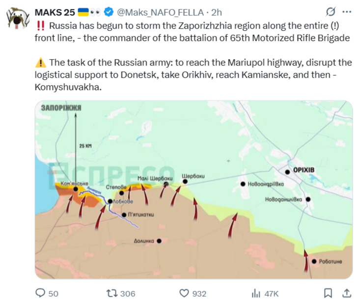 The biggest news on the front is the announcement by various Ukrainian sources that Russia has launched a full blown offensive in Zaporozhye across the length of the entire front.