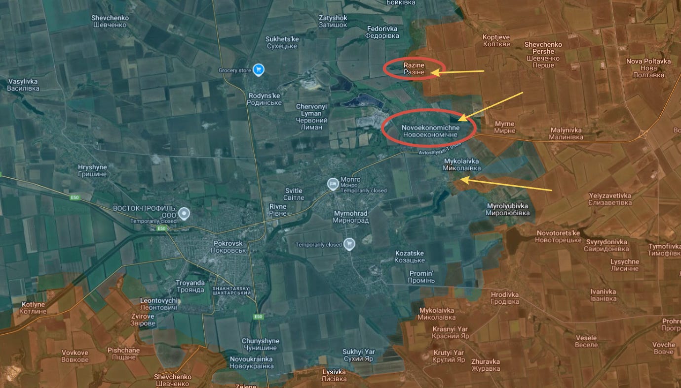 Between Pokrovsk and Toretsk, Russian forces expanded control around Razine, west of recently-captured Koptjeve. They continue to put encircling pressure on the Pokrovsk-Mirnograd agglomeration by now assaulting towards Novoekonomichne: