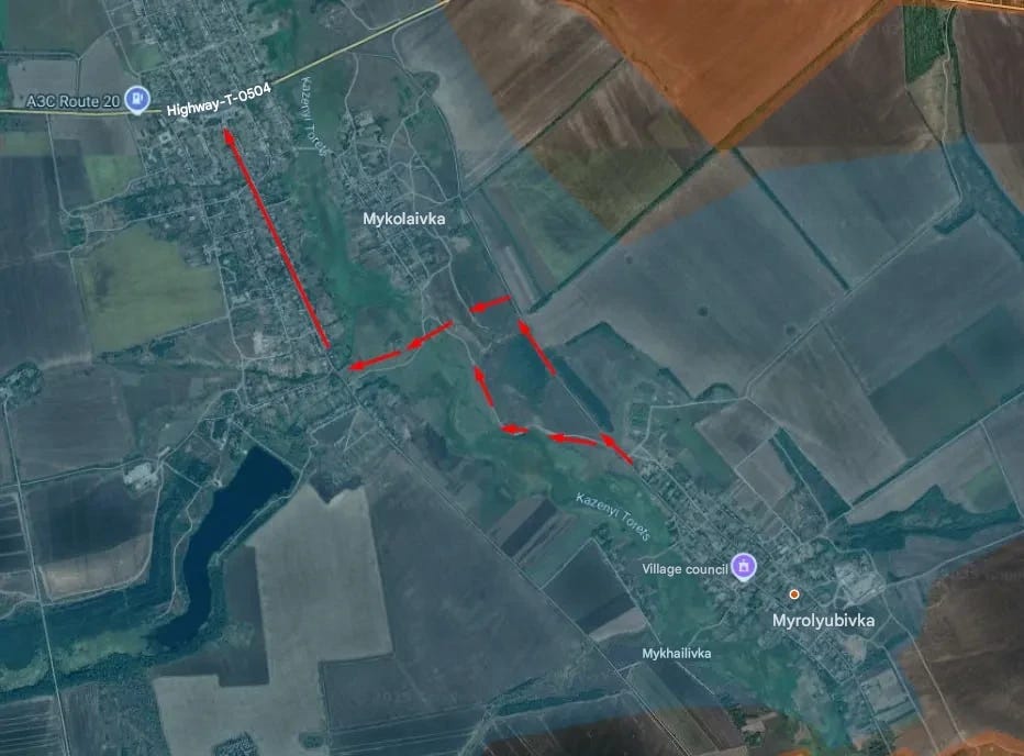 Ukrainian footage of a Russian column geolocated passing through Mykolaivka into neighboring Novoekonomichne: