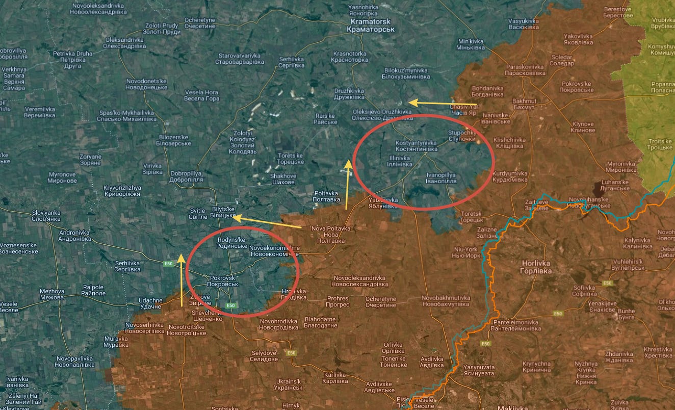 The general situation is that Russian forces are slowly effecting a cauldron around the key cities of Konstantinovka and the Pokrovsk-Mirnograd agglomeration: