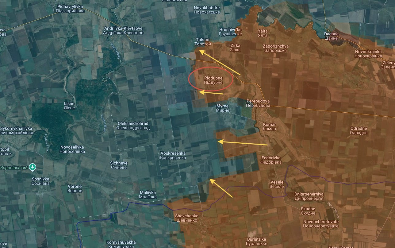 Further east, in the last update we had reported how Russian forces began to approach Poddubne and Voskresenka, north of the Velyka Novosilka front. Now Russian forces have fully captured Poddubne and even expanded areas of control all around it:
