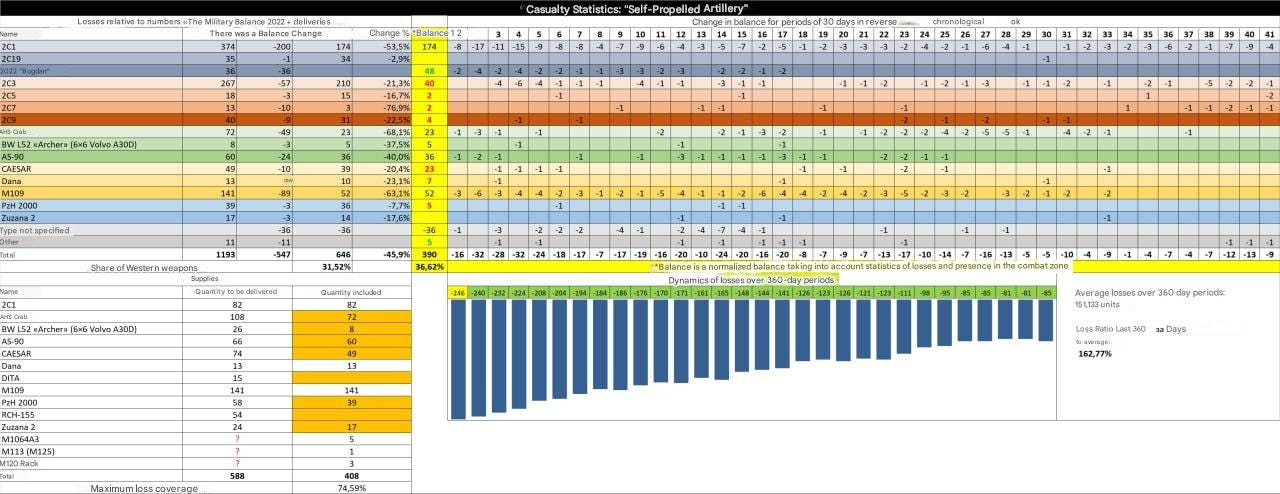 It shows 646 self-propelled artillery of various kinds still remaining, though it must be taken into account that: 1. it’s a very conservative methodology in regard to counting losses—for instance, I’m almost positive I’ve seen far more than merely 3 PzH 2000s destroyed; and 2. a huge portion of those assets would be inoperable at any given time due to maintenance issues. Again, with the PzH 2000 in particular, we’ve seen in previous Western publications that a large number of them have broken down on the front. Out of a possible 646, I’d wager 350-400 active at any given time, if not less.