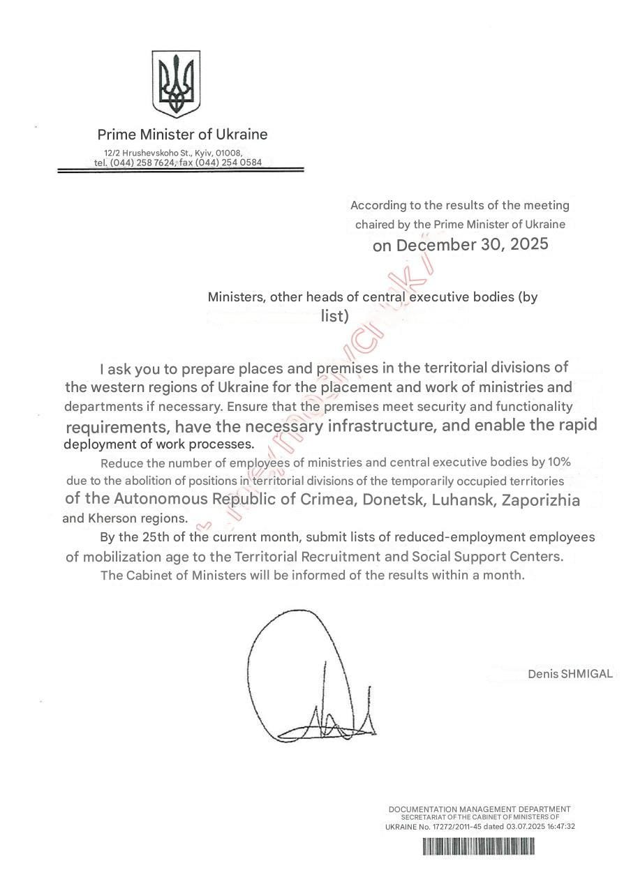 Here is such a document that was sent out today by the Cabinet of Ministers to government bodies and state structures. It states that a Decision has been made and the corresponding Orders are being issued to prepare places and premises in the territorial divisions of the western regions of Ukraine for the placement and work of ministries and departments if necessary.