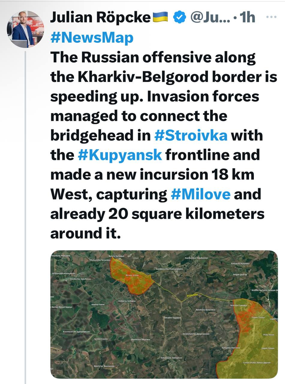 The other big update is that Russian forces made an unexpected breakthrough in the north Kharkov region, capturing a new chunk of Ukrainian territory just over the Russian border northwest of Kupyansk: