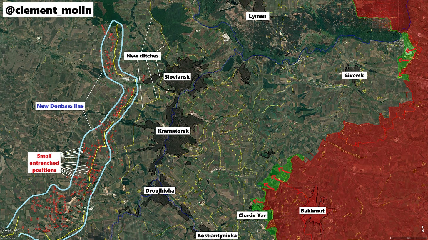 The two ukrainian lines forming together the "New Donbass Line" are both beyond all Donbass cities, Izioum, Lyman, Sloviansk, Kramatorsk, Droujkivka, Kostiantynivka, Dobropilla, Pokrovsk. The new one, in orange, is not yet very developped, only few positions and 1 to 2 ditches.