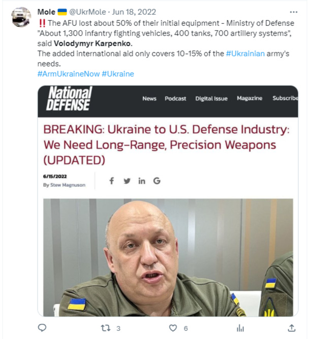 Here we have the Ukrainian ministry of defense admitting in June 2022 that they lost not only 50% of all initial equipment in only 4 months of fighting at that point, but staggeringly, they had lost 400 tanks. Also, as an aside, at that point, Oryx had only listed 116 tank losses for the AFU. This clearly shows the laughable bias in Oryx’s accounting as the official AFU count of their own losses was 4x higher than his.