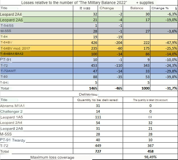 This is important because Ukraine is said by some sources to have started out with 1,200-1,500 total operable tanks, with another batch mothballed. But some experts believe the operable starting number was much closer to 800. That means we can extrapolate that if Ukraine had already lost 400 tanks by June, in only 4 months of fighting, by the end of 2022 they should have lost somewhere around another 600, which would put them at ~1000 for the year. So if the 800-1200 figure for their starting number of tanks is accurate, they would have completely depleted those by early this year, which in fact confirms the folklorish claim that they had lost their entire starting army.