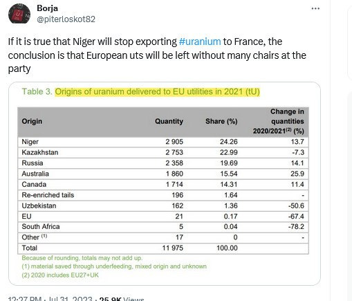 France is the #1 country in the world for total percentage of nuclear use for energy generation, and #2 in total number of nuclear power plants. I’ve seen figures that Niger supplies upwards of 40% of France’s Uranium, though some have it in the 15-25% range, as well as 25% to the EU itself.