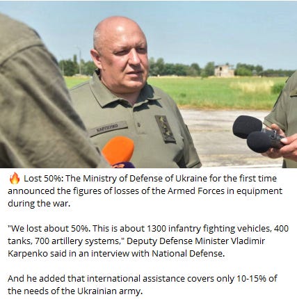 This new Sputnik article covers it in detail. But one critical mistake they make is that they misattributed a quote by Ukrainian ground forces commander Volodymyr Karpenko, who says Ukraine lost up to 50% of equipment, to the present day. However, his quote is actually from a June 2022 National Defense interview, which makes it all the more interesting.