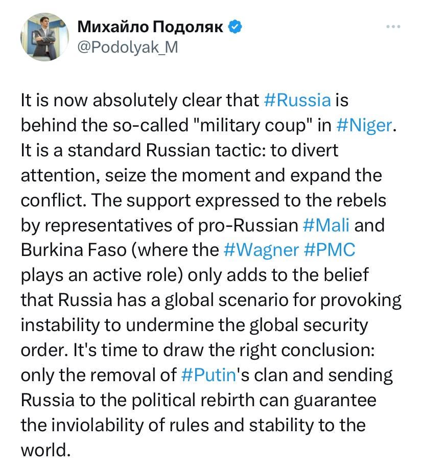 What Podolyak is referencing is that Mali, Burkina Faso, and Nigeria immediately issued statements coming to the defense of Niger, stating that any attempts from other countries to intervene against Niger’s ‘transition government’ would be a declaration of war: