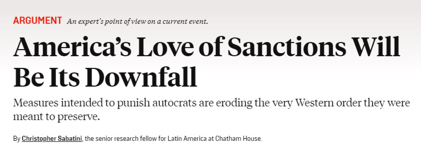 His words are echoed by the new Foreign Policy article which states that America is eroding its power and the reach of the global financial system by its addiction to sanctions: