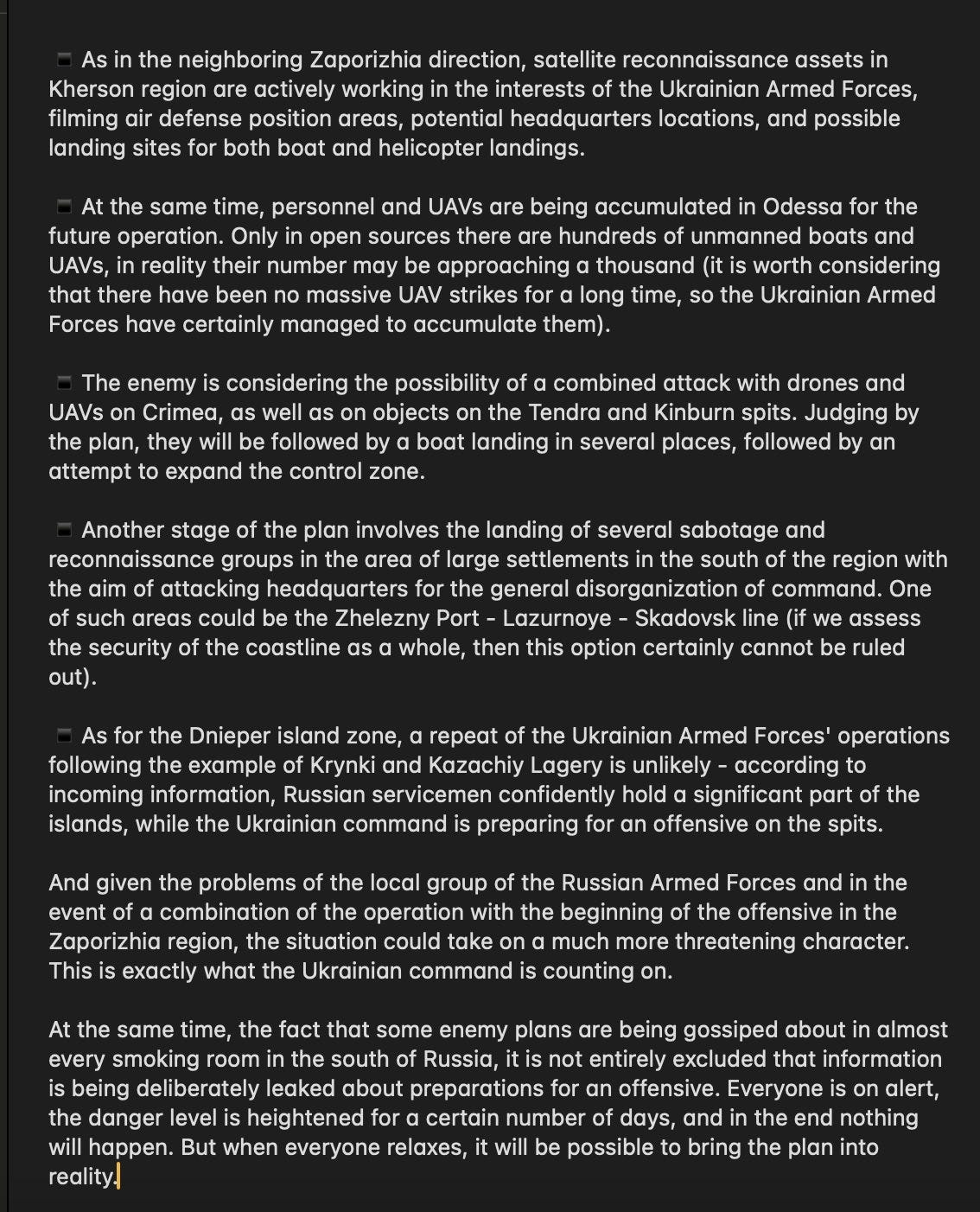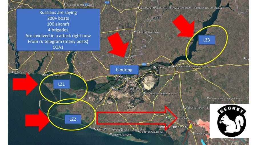 A simultaneous mass landing by special forces around the Kinburn Spit area to harass the ‘rears’ of Russia’s Dnieper grouping, while other amphibious forces directly strike at the Energodar plant and then the main logistics force tries to wrap around from Zaporozhye city along the river to connect with them.