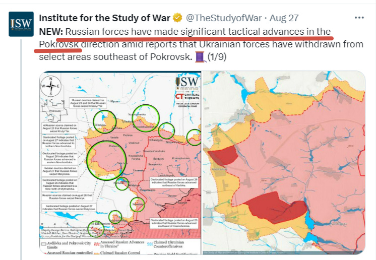 Here’s the best current write up with good maps of the Pokrovsk situation from one of the more level-headed and critical-thinking Ukrainians, Tatarigami: https://euromaidanpress.com/2024/08/28/what-the-fall-of-pokrovsk-could-mean-for-ukraine/
