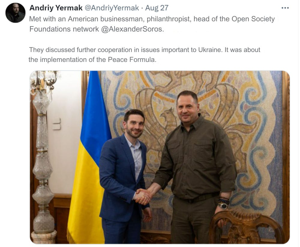 Notice he says the meeting was about the implementation of the “peace formula”. So, Soros is now being given a direct seat at the table in Ukraine’s negotiations?