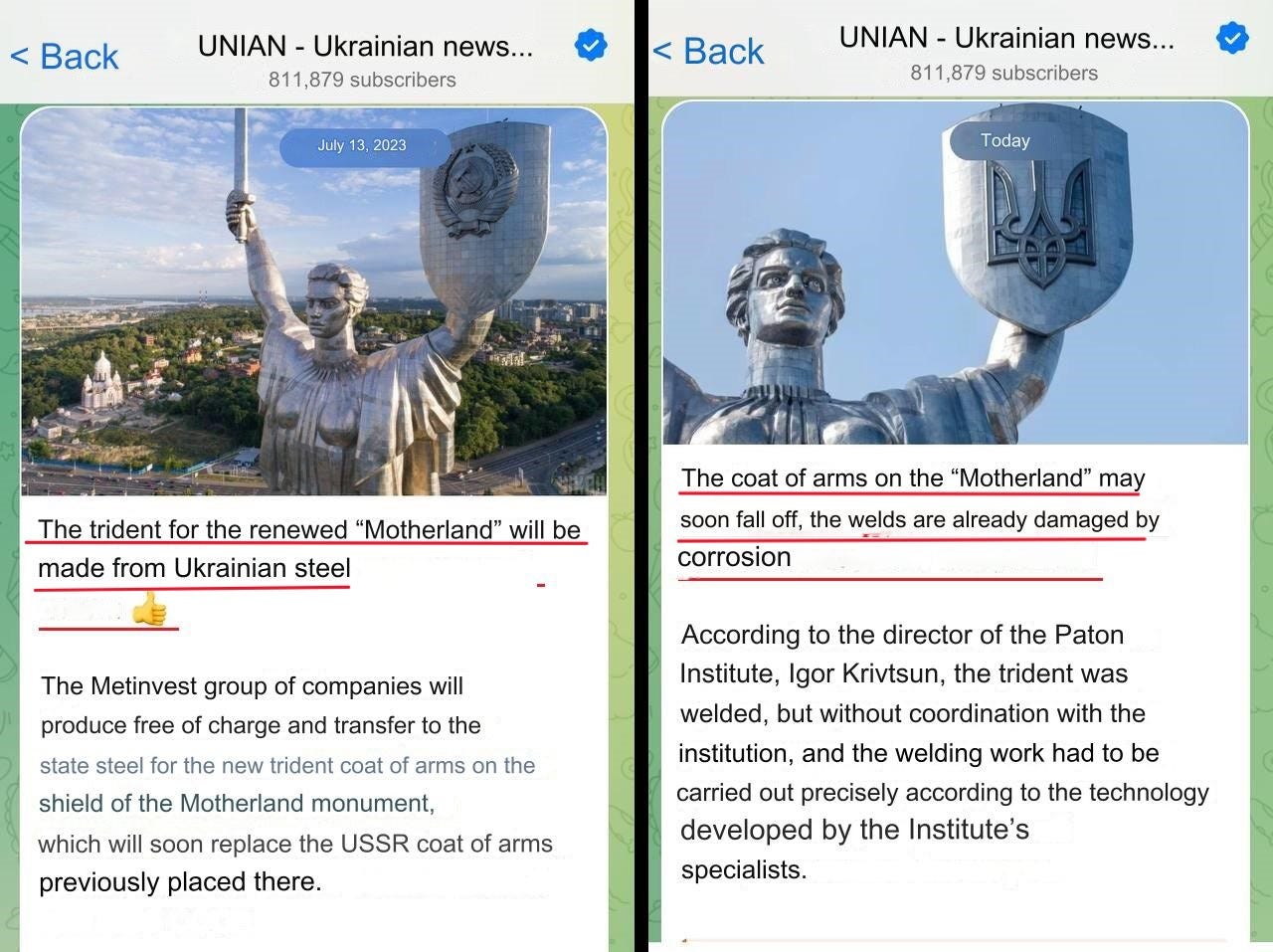 This was a story from several weeks back I forgot to include, but it’s too good not to share. Remember when Ukraine desecrated the Soviet statue? Now Ukrainian news reports their hastily fashioned trident crest made from special heroic “Ukrainian steel” is already rotting and in danger of falling off—call it karma!