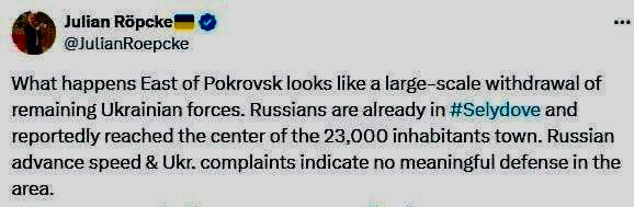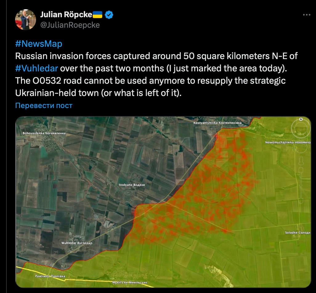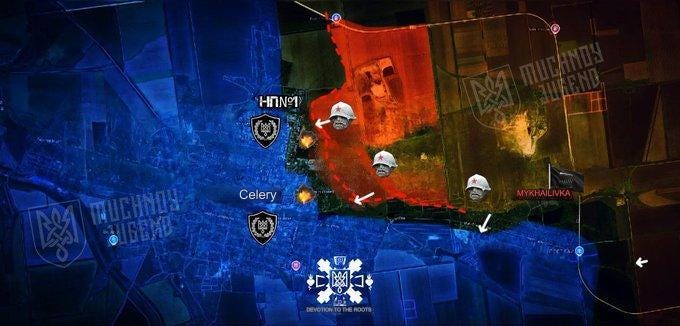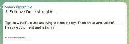 "Battles for Selidove have begun! The enemy is actively pushing our defenses on the eastern outskirts of the city, the fighting continues in the area of the stadium and the park, slowly moving towards the high-rises, also the podars are trying to level the front and are starting to press from Mykhailivka to the south and push from the highway in the east. The same squeeze situation occurred in New York."