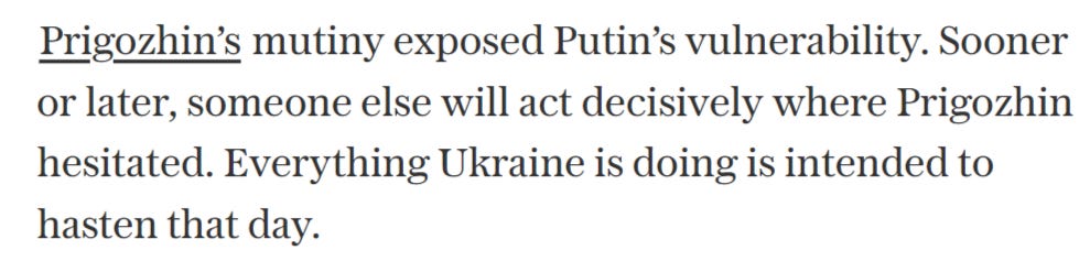 It ends on this capstone which perfectly encapsulates everything we’ve been writing here for months—that the only goal of this war was not to defeat the Russian army but to foment the conditions of a coup against Putin, so that a CIA-appointed leader can again take over Russia and drive it to its demise: