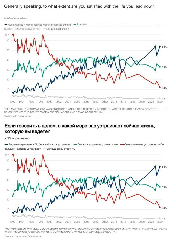 This has been corroborated by other recent surveys showing Russian life satisfaction is peaking at record highs, while dissatisfaction is plummeting to all-time lows. The image translator couldn’t quite get the colors below, but the blue line is ‘quite satisfied’, green is ‘partly satisfied’, and red is ‘absolutely not satisfied’: