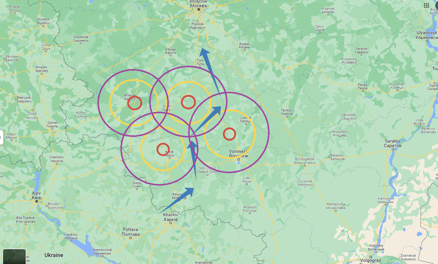 But since the drone is flying at a hypothetical 100ft, the only circle above that would detect it would be the red one. Or even if it’s flying at 1000ft, the yellow circle would detect it, but those have slight gaps in between. By studying the placement of the radars from signal intercepting satellites, Western partners can plot a route for Ukraine’s drones as seen by the blue lines, which snuggle in between the yellow circles and circuitously get to Moscow in the north.