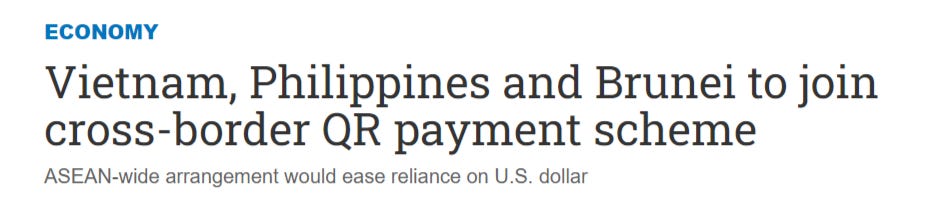 Vietnam, the Philippines and Brunei will join other major Southeast Asian economies in an interconnected QR code payment system that aims to reduce reliance on the US dollar - Nikkei reported. (https://asia.nikkei.com/Economy/Vietnam-Philippines-and-Brunei-to-join-cross-border-QR-payment-scheme)