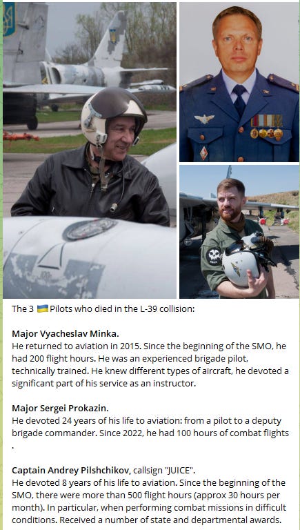This comes only two days after the news that some Ukrainian stunt in the west of the country caused 3 notable and decorated pilots to be killed when their trainer L-39 planes crashed into each other: