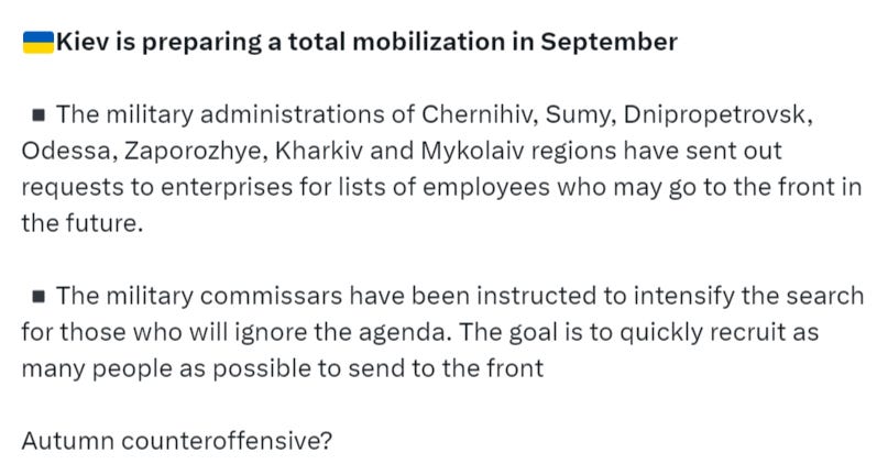 The theme continues to revolve around large new mobilizations slated for Ukraine’s near future—some believe as soon as early September: