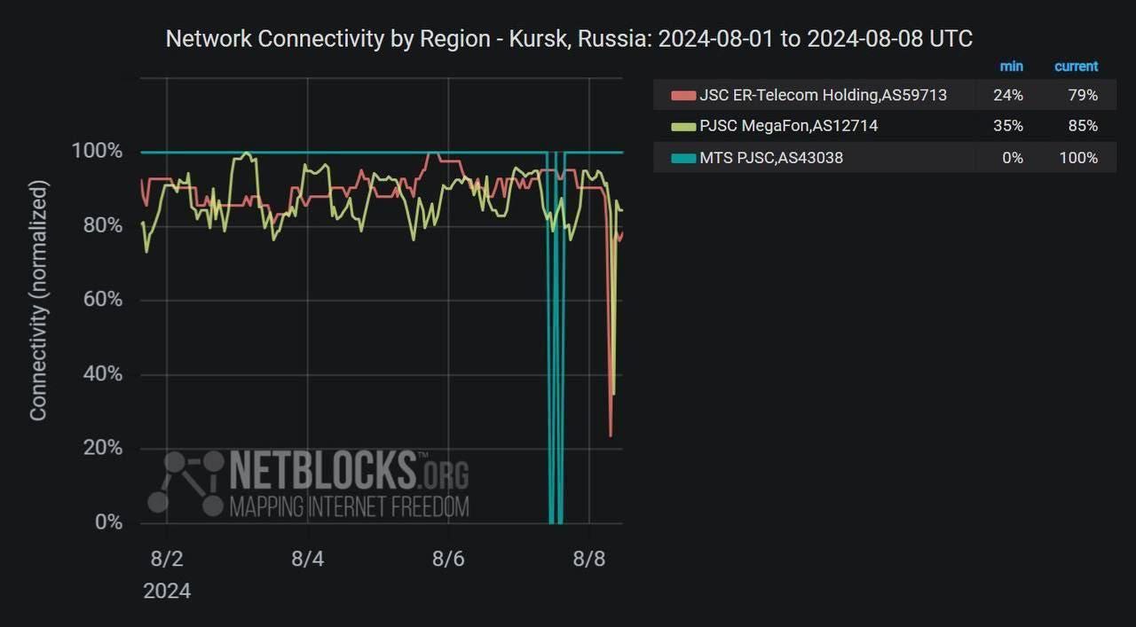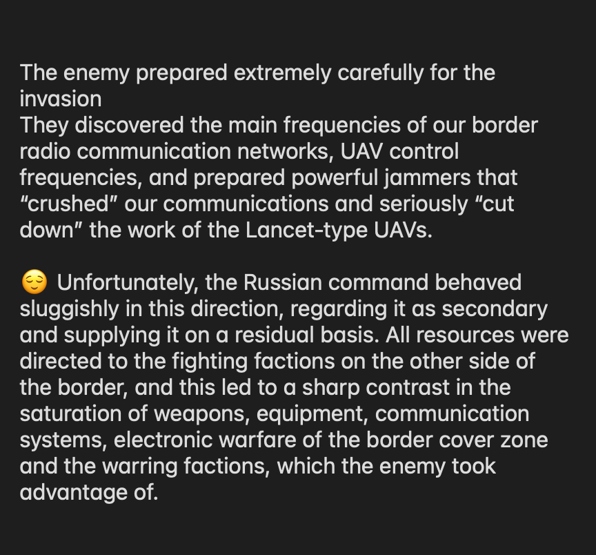 Since many Russian groups use various WhatsApp/Discord/etc. type of apps to coordinate, this likely affected communications along with the EW jamming. As reported last time, all this was also timed with a mass psyop campaign, like the deep fakes of the Kursk region governor I posted last time, meant to sow confusion at a critical moment.
