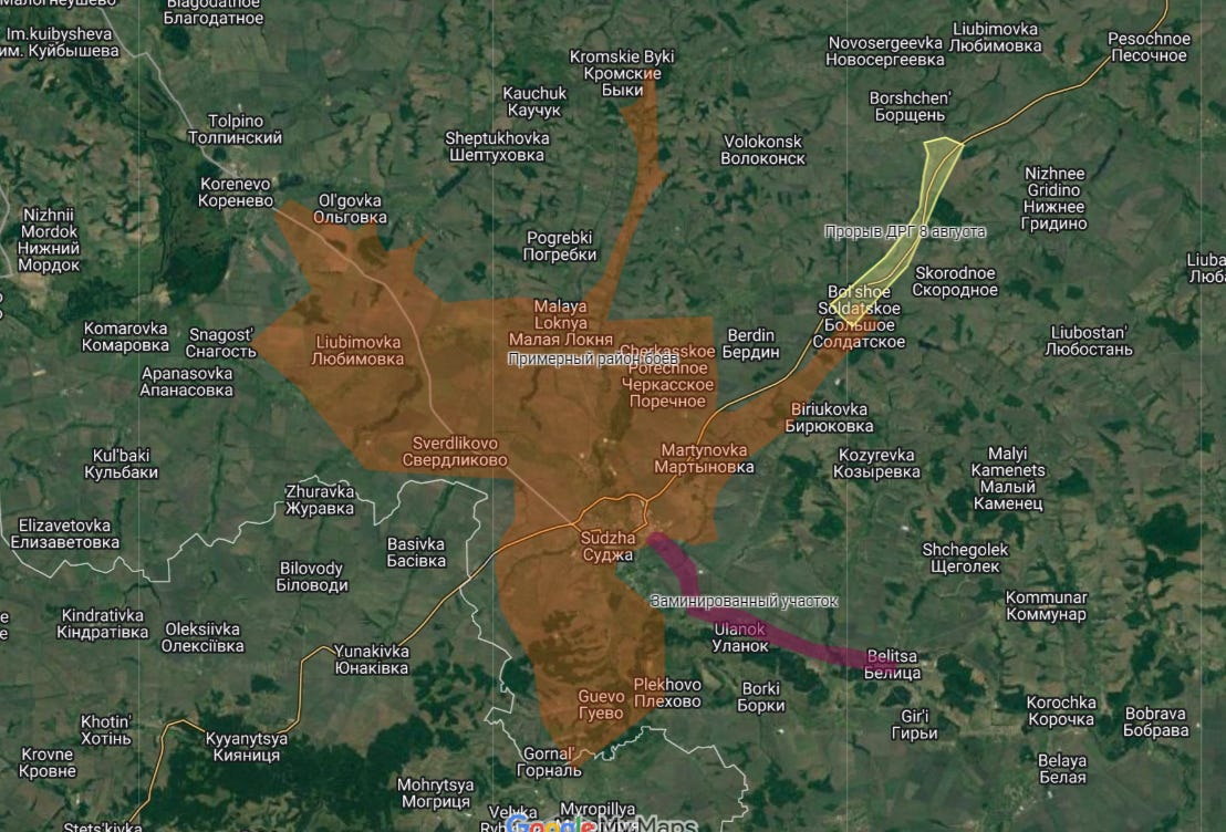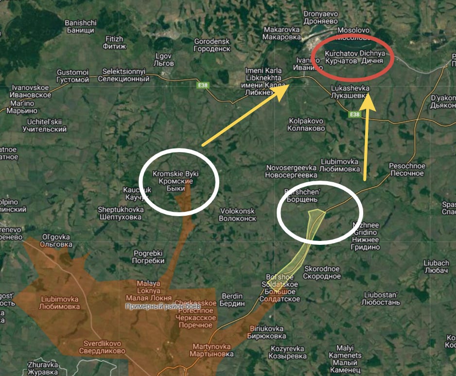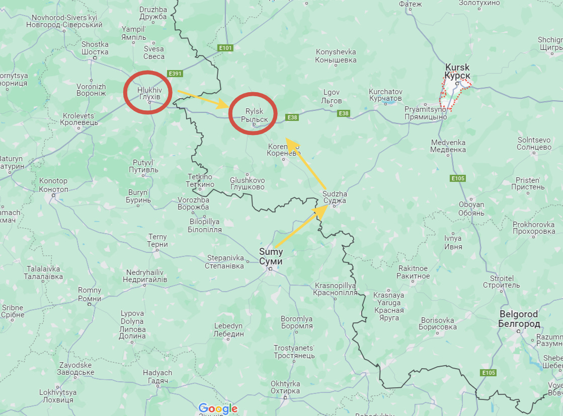 The likely vector would be further west around Glukhov (Hlukhiv on map), in order to cut across to Rylsk, where they would meet the initial force coming in from Sudzha, to entirely cut off that “shelf”, which would give them total control of a good portion of Russian territory from which they could subsequently stage brigade level advances toward the Kursk plant: