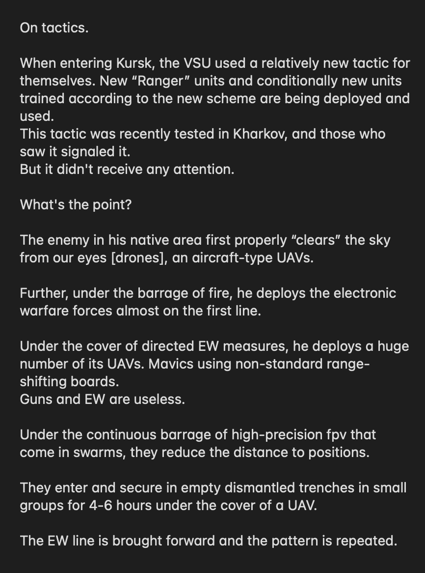 Ukrainian officer Tatarigami has written an entire article that—despite the “successes” in Kursk—continues to show skepticism toward the operation, given how badly the Donbass front is collapsing for the AFU: