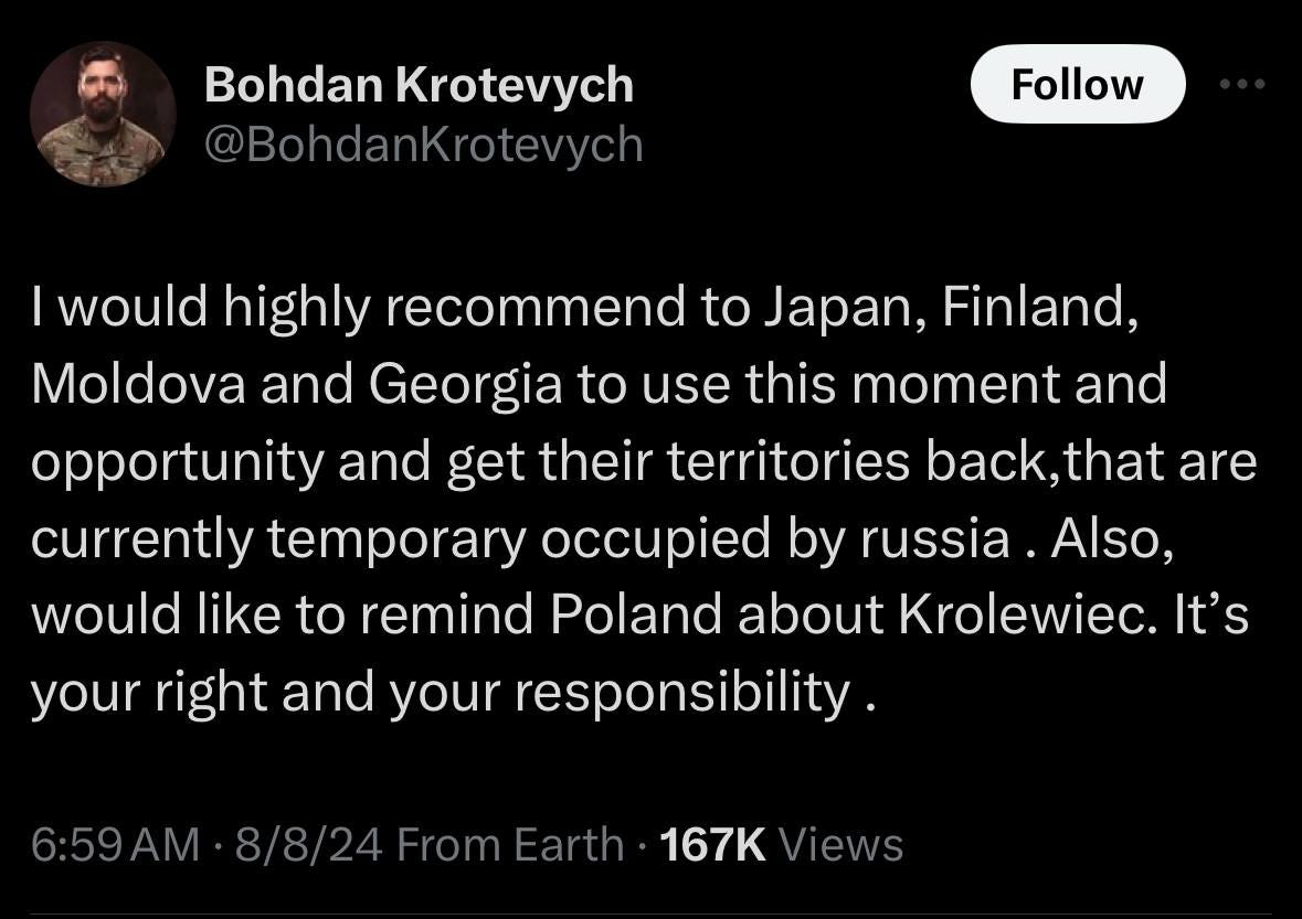 Lastly, notorious Azov acting commander Bogdan Krotevych calls for Russia’s enemies to take advantage of the Kursk gambit and regain their territories: