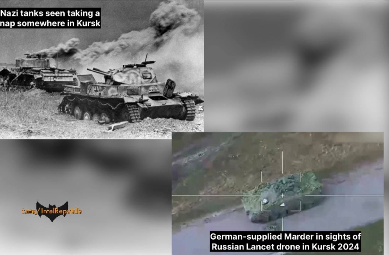 Here they are being hit when Russian Lancets decimated Ukrainian columns in the Kursk region yesterday: