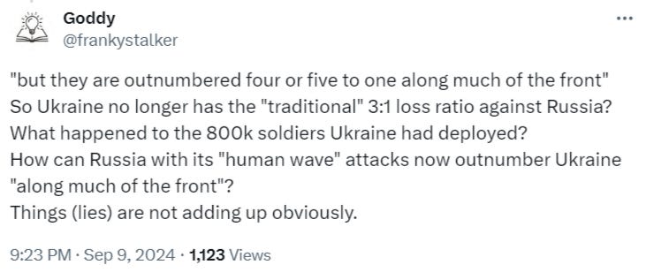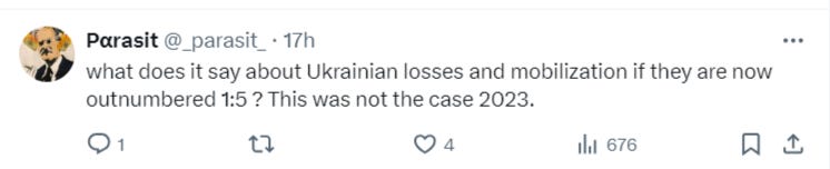 Here’s an interesting discursion. The above commander states they’re outnumbered 5:1. The earlier article’s commander stated on his front that ratio is 10:1. Even pro-Ukrainian commenters could not hold back from asking the obvious questions under Rob Lee’s post of the above article:
