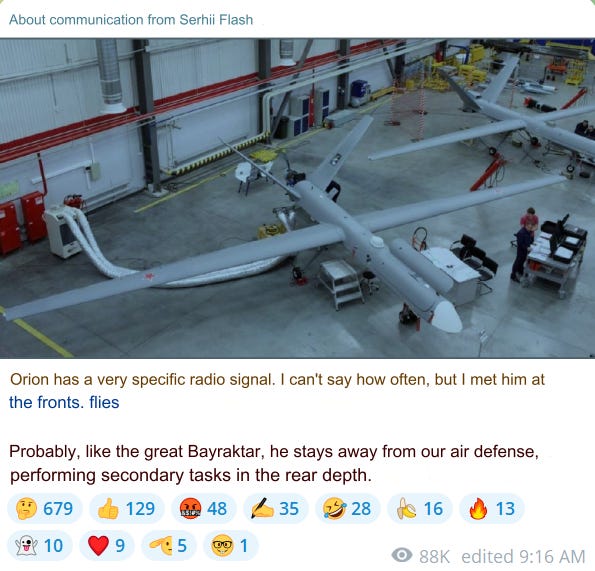 If it was just that one errant video, I would not have even made the report. But there has been two separate direct reports from the front I’ve read this week attesting to this development. One simply was a confirmation from Russian military sources that the drones are now being used in Kursk. The second, was a confirmation from the AFU’s top radioelectronics expert, Serhiy Flash, that he has now “detected” multiple Orions operating on the front several times—which you can see for yourself here: