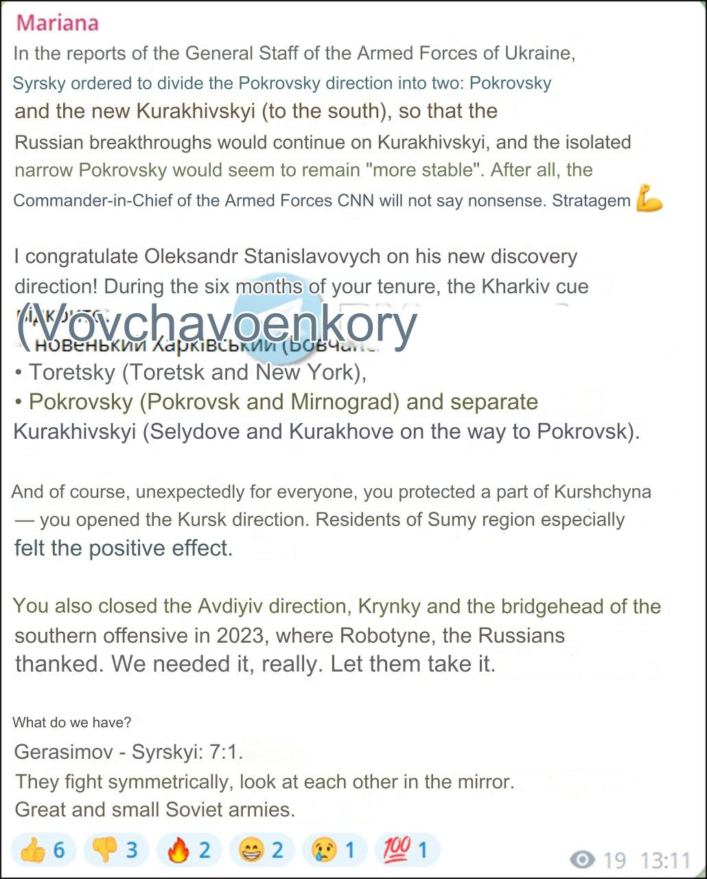In fact, my thesis was corroborated by Rada MP Mariana Bezuglaya who wrote on her social media that Syrsky even intentionally began to play with information reporting so as to obfuscate the true nature of the Pokrovsk direction, vis-a-vis Russia’s rerouting southward toward Kurakhove: