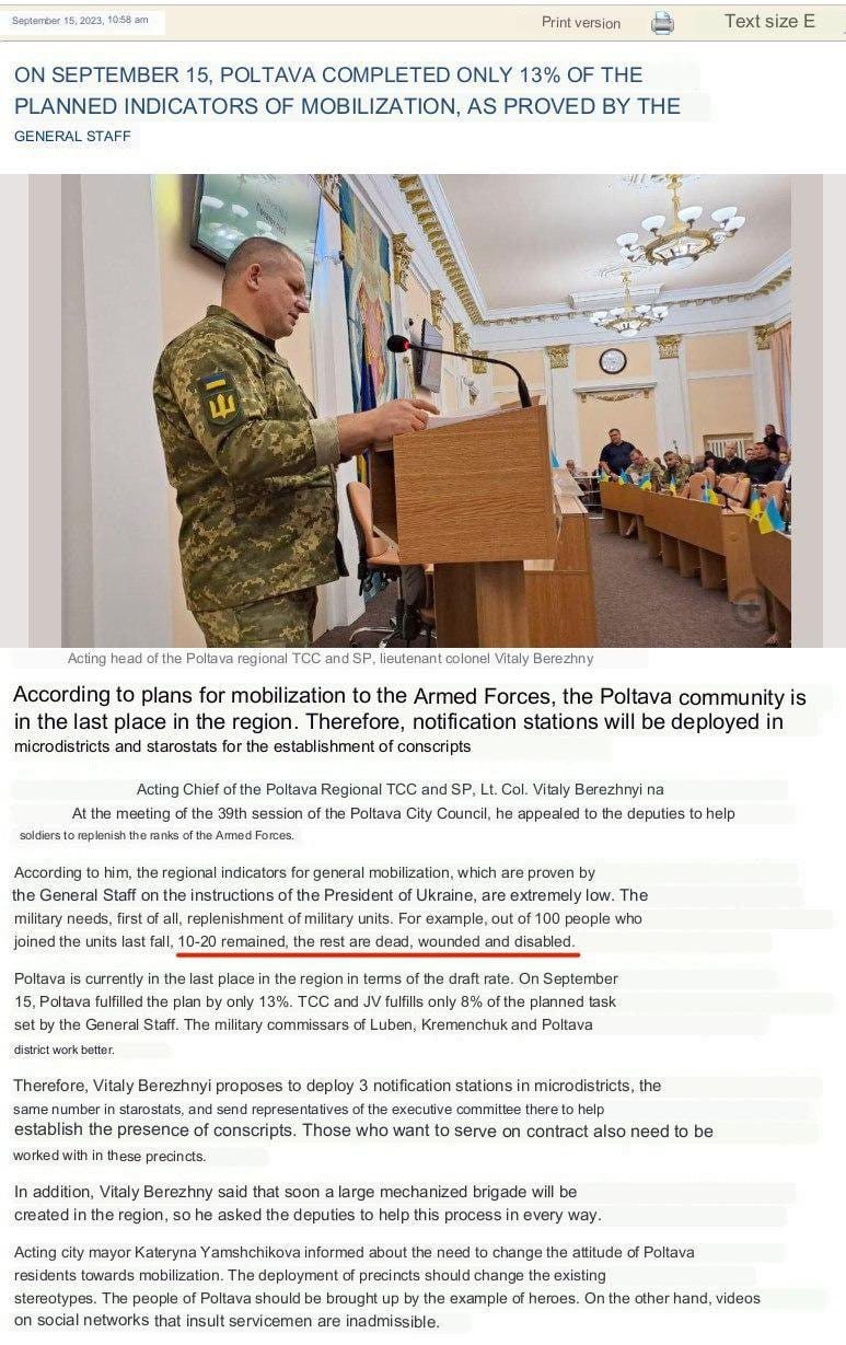 \🇺🇦⚡️Losses of last year's replenishment of the Armed Forces of Ukraine amounted to 90 percent - military commissar of Poltava