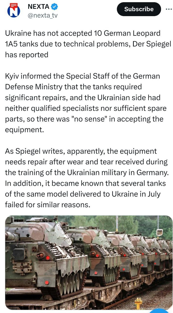 1. Recall I had reported for months on how Germany was fast-tracking and expediting a small emergency shipment of the Leopard 1s in July in order to plug gaps in the unforeseen destruction of Ukraine’s main armor units during the opening stages of the “counteroffensive”. Apparently, according to the above, even that emergency shipment was defunct and useless.