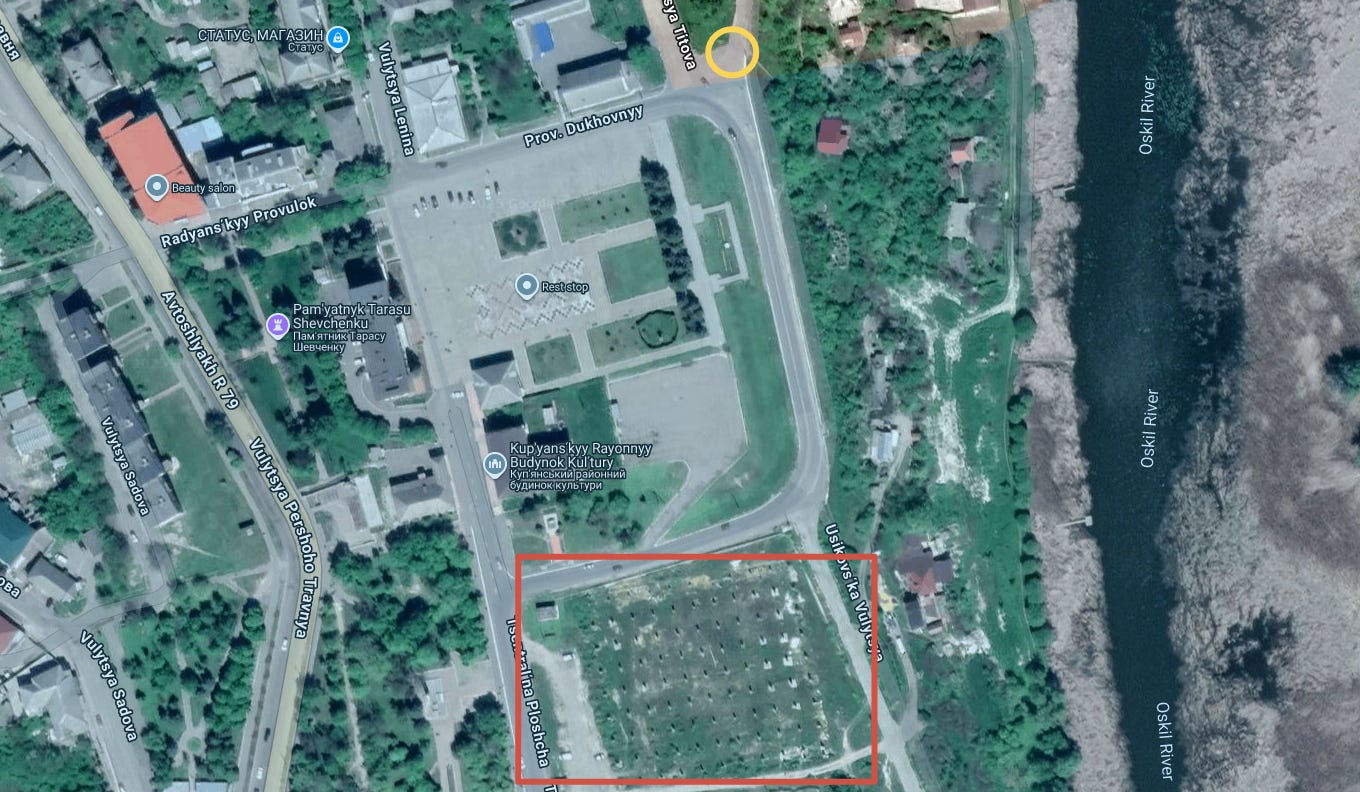 The red shows the cemetery-looking structure, with the yellow circle where the soldier is standing: