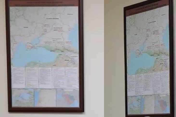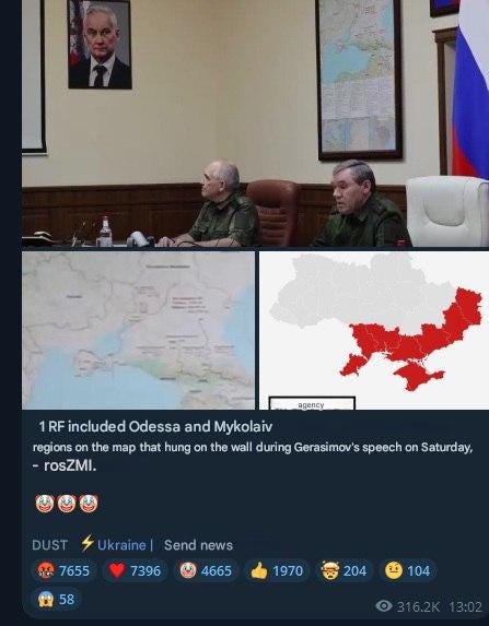 Incidentally, during Gerasimov’s recent broadcast general staff meeting, a map was spotted on the wall which shows Russian territory as encompassing all of Kherson, Nikolayev, and Odessa regions:
