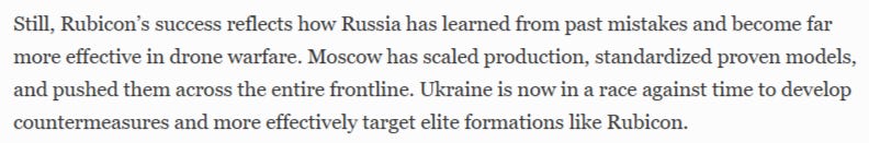 The article notes that Rubicon is coordinating its drone forces more and more closely with Russian assault units, for instance using the Molniya (“Lightning”) drone to attack Ukrainian defenders in conjunction with Russian assault units.