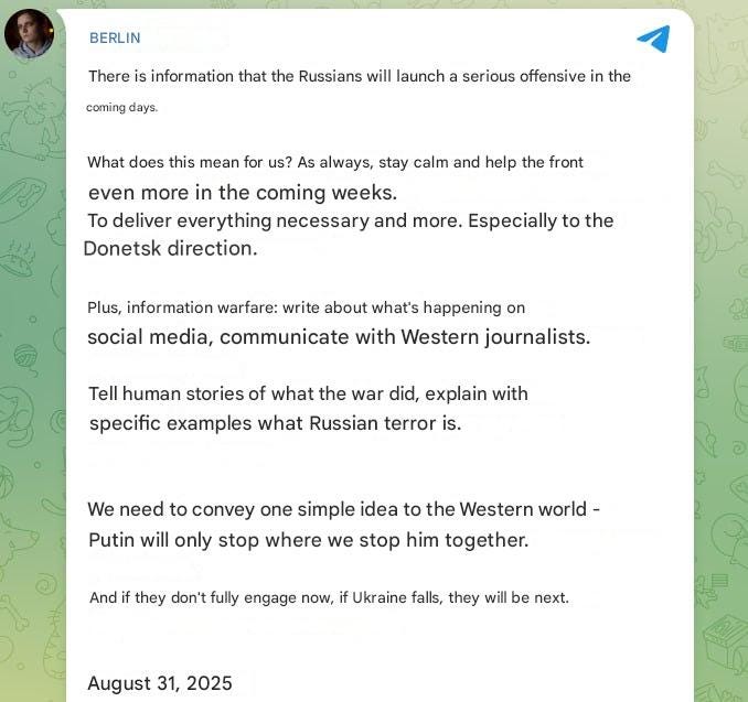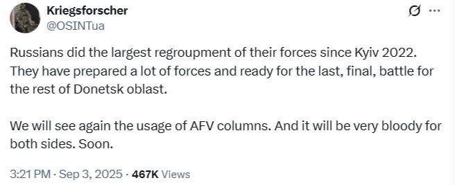 The Russians have carried out the largest regrouping of their forces since Kyiv 2022. They have prepared significant forces and are ready for the final, decisive battle for the rest of the Donetsk region. We will see the use of armored columns again. And it will be very bloody for both sides.