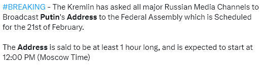 And on top of that, the Russian federal council and Duma will convene an ‘extraordinary session’ (basically means unplanned) on February 22, which could be designed to ratify new initiatives announced in Putin’s address.
