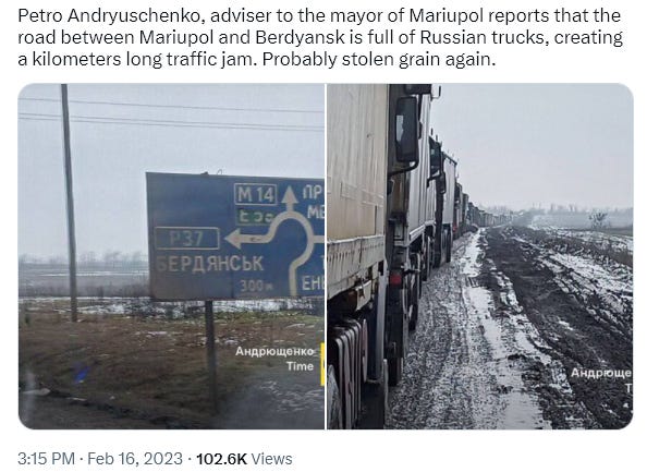 5. A massive 80km long convoy of Russian army supply trucks is reported to be currently in transit slowly through mud between Mariupol & Berdiansk, according to ‘advisor to the mayor of Mariupol’ Petro Andryuschenko. Keep in mind this is the exiled Ukrainian ‘ex-advisor’ to the previous Mariupol administration prior to its liberation.