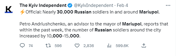 Andryuschenko is the same one who reported last time that Russian troops have massively increased by ‘tens of thousands’ north of Mariupol, which was later specified as going from 10k to 30k troops.