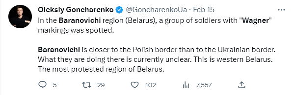 6. Ukrainian MP Goncharenko claims that in far western Belarus, a group of ‘Wagner’ soldiers were spotted.