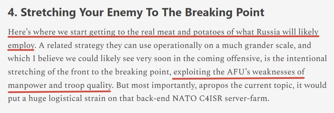 It was part one of an ongoing series where I attempted to divine precisely what the future of Russia’s offensive strategy would look like. The first part dealt with establishing a correct historiography of the early part of the SMO, as I felt that the most common misunderstandings of the present SMO developments stemmed from an incorrect set of assumptions—or indoctrinated fallacies—about the actual numbers and motivations involved at the beginning.