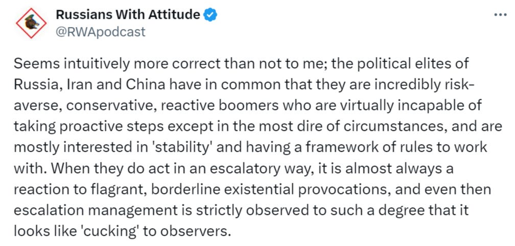 Any overwhelming attack that could critically wound Israel may provoke an Israeli nuclear response—further proving Iran does not have the escalatory advantage or trump card. That is like Ukraine “declaring war” on Russia—what possible meaning would that have? Ukraine does not have the escalatory dominance to ever ‘submit’ Russia in any way, and the only objective of true ‘war’ is just that—total victory and the subjugation of the adversary. Thus, I see no logical way war can be declared, unless Iran did finally secretly hatch that bomb and is ready to use it. The only other possibility is for PR reasons to satisfy the demands of the angry populace, before declaring victory after some arbitrary objectives have been carried out via a series of strikes, and calling it a day.