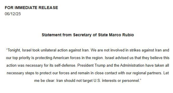 Reportedly, the White House stated earlier that the US would not be involved in any unilateral Israeli actions, and as soon as the strikes began Rubio made sure to distance the US in an official statement: