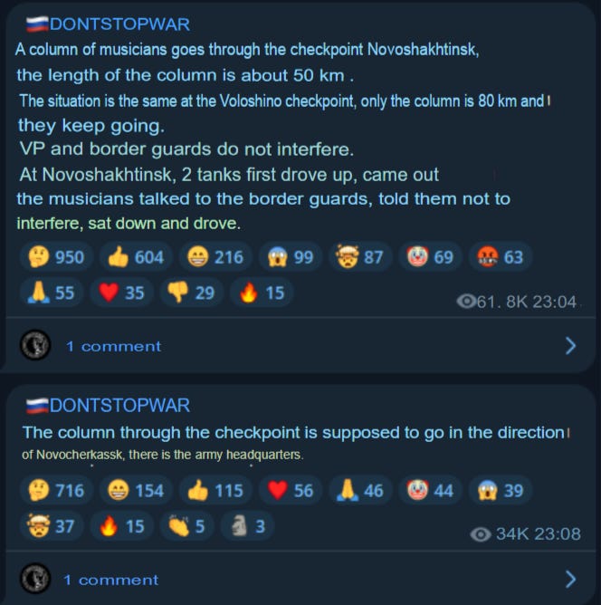 The thing is, despite the actual criminal proceedings being set in motion and various Russian regions going on heightened alert, as of this writing there is no proof at all that Prigozhin is actually marching any “column” of Wagner troops to Rostov or anywhere else. One would think the claimed 50km long column would be visible and documented from a variety of sources at this point.
