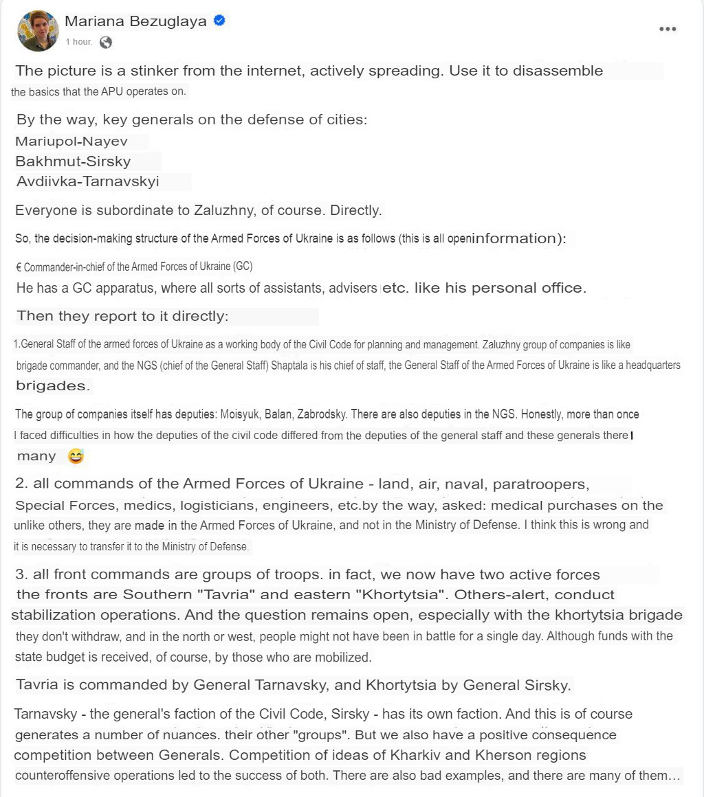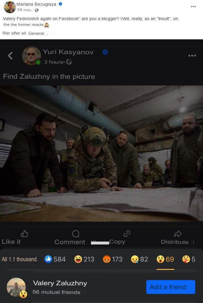 She made a comment on facebook agreeing with someone pointing out that Zaluzhny was missing from this Stavka meeting, and Zaluzhny himself subsequently “reacted” to her comment with a smiley face, which can be seen below. Yes, this is what things have devolved into—high school social media intrigues! That’s Ukraine, folks.