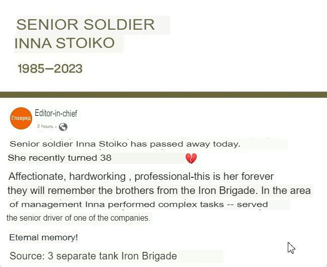 ⚡️⚡️⚡️The first female tankman, Inna Stoiko, of the 3rd Tank Brigade was eliminated⚡️⚡️⚡️